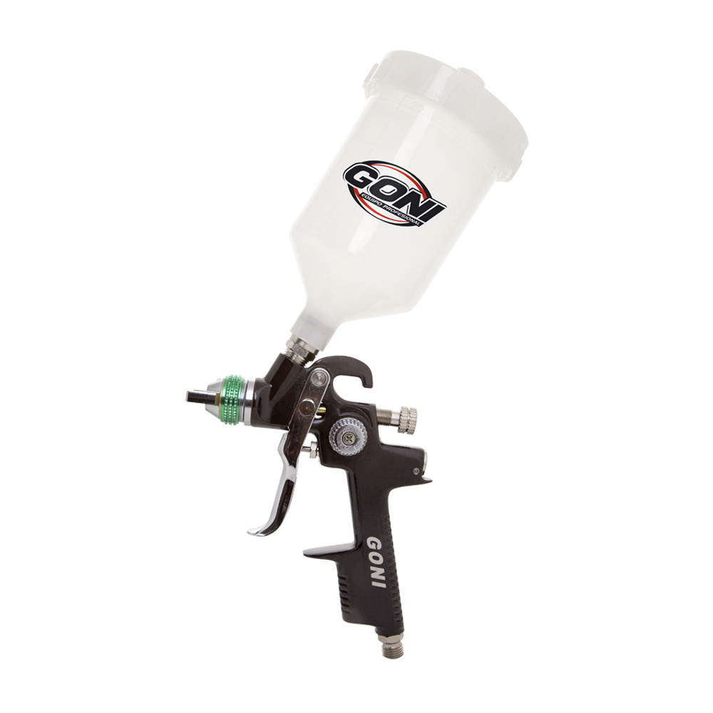 Pistola de tipo HVLP, alimentada por gravedad cuenta con tres controles; material, abanico, aire. Pistola de dos pasos.
